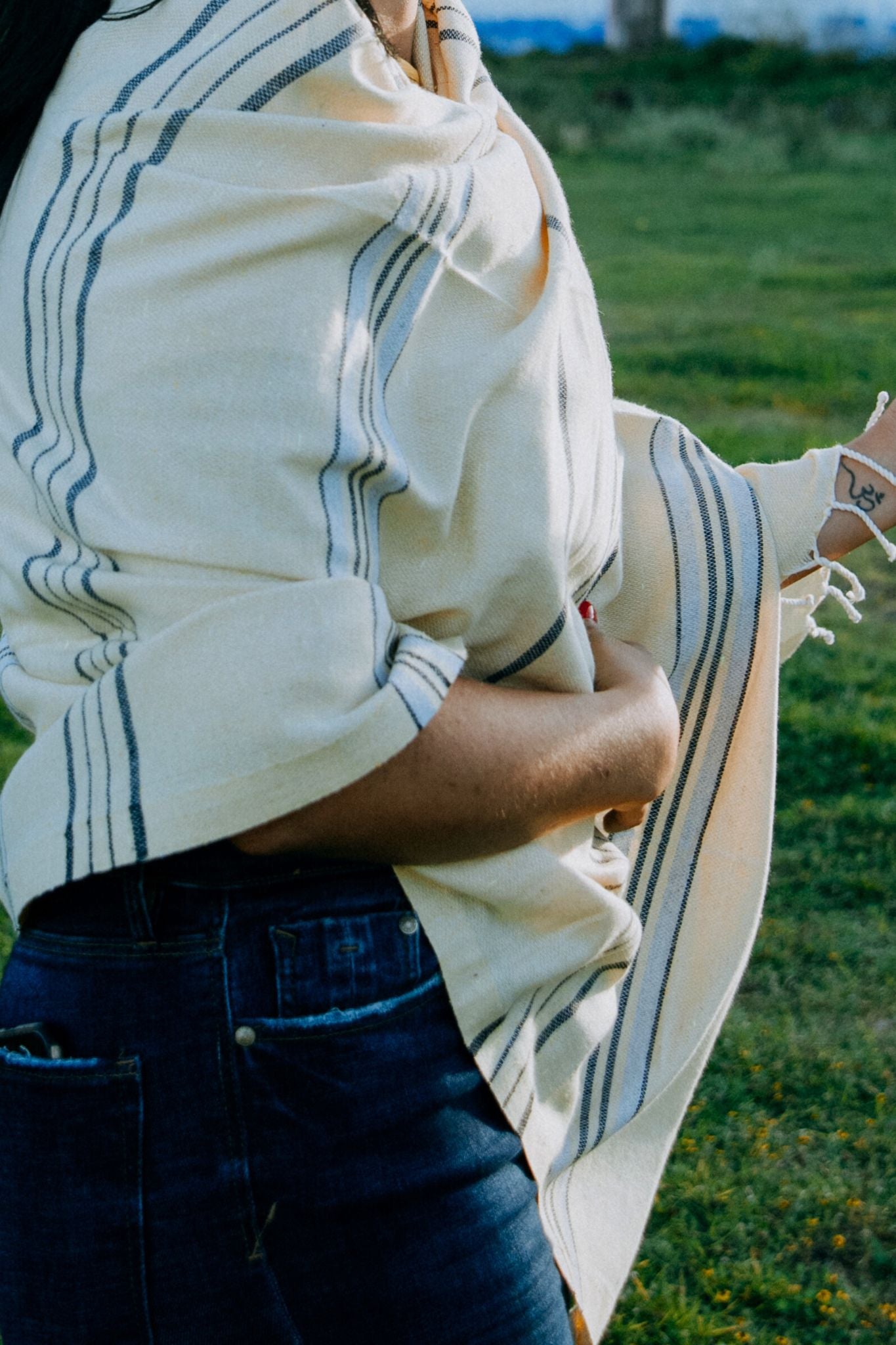 Nupesh es una toalla-pareo, frazada y/o poncho ecoamigable y artesanal (sus puntas anudadas a mano).